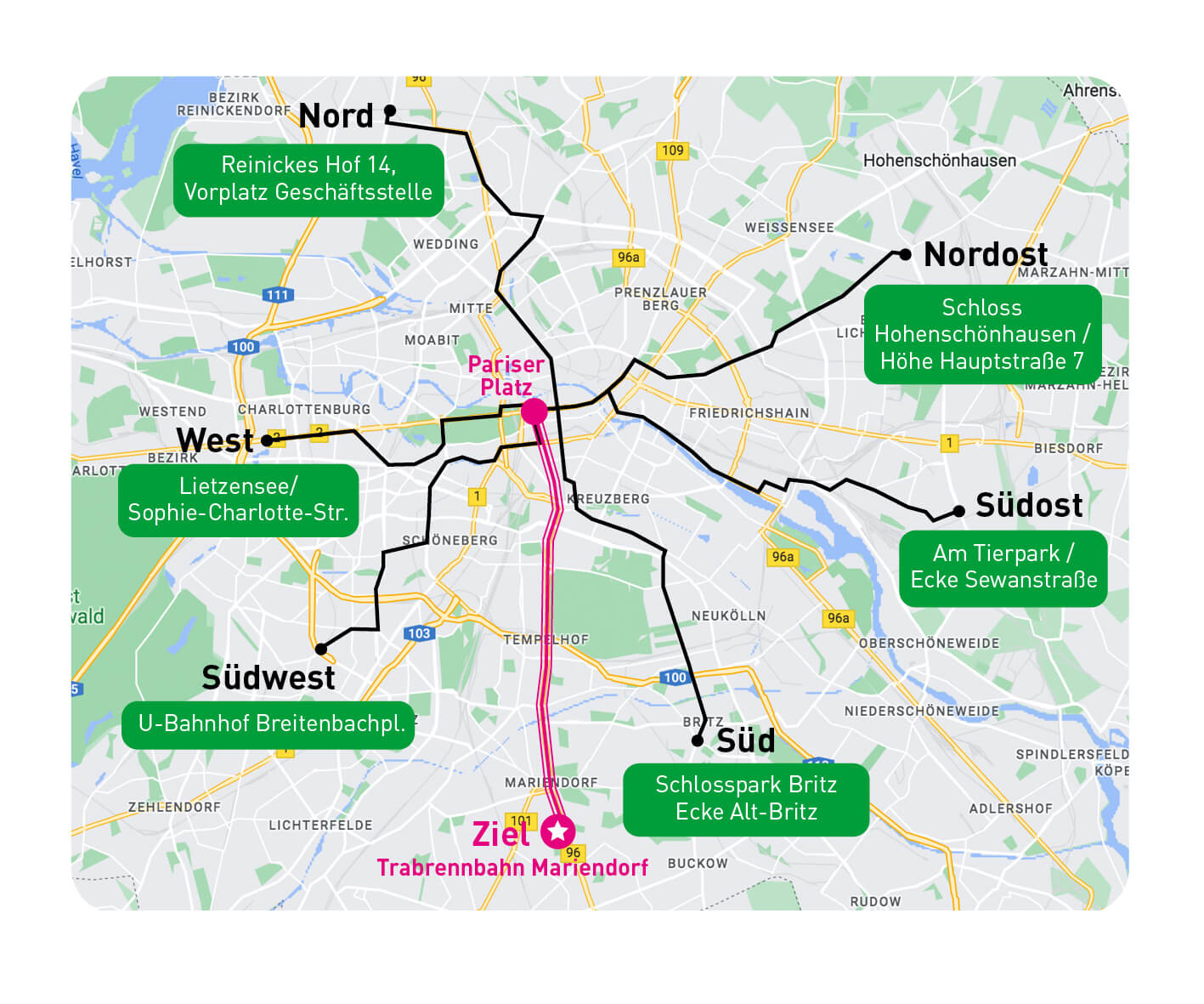 Von sechs frei wählbaren Startpunkten aus fahren die Mitglieder der Wohnungsbaugenossenschaften Berlin als Botschafterinnen und Botschafter der genossenschaftlichen Idee in grünen Trikots über die Straßen Berlins. In Polizei-Begleitung geht es für die sechs Gruppen zum Treffpunkt am Brandenburger Tor und anschließend gemeinsam weiter zur Trabrennbahn Mariendorf, wo ein buntes Programm auf alle wartet. Für das leibliche Wohl nach der Fahrt wird ebenfalls gesorgt. Wer lieber direkt zur Trabrennbahn kommen möchte, ist herzlich eingeladen, vorbeizukommen. Als Eintrittskarte gelten auch hier die Trikots!